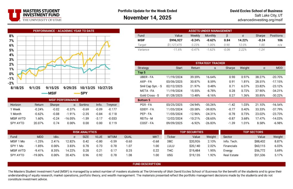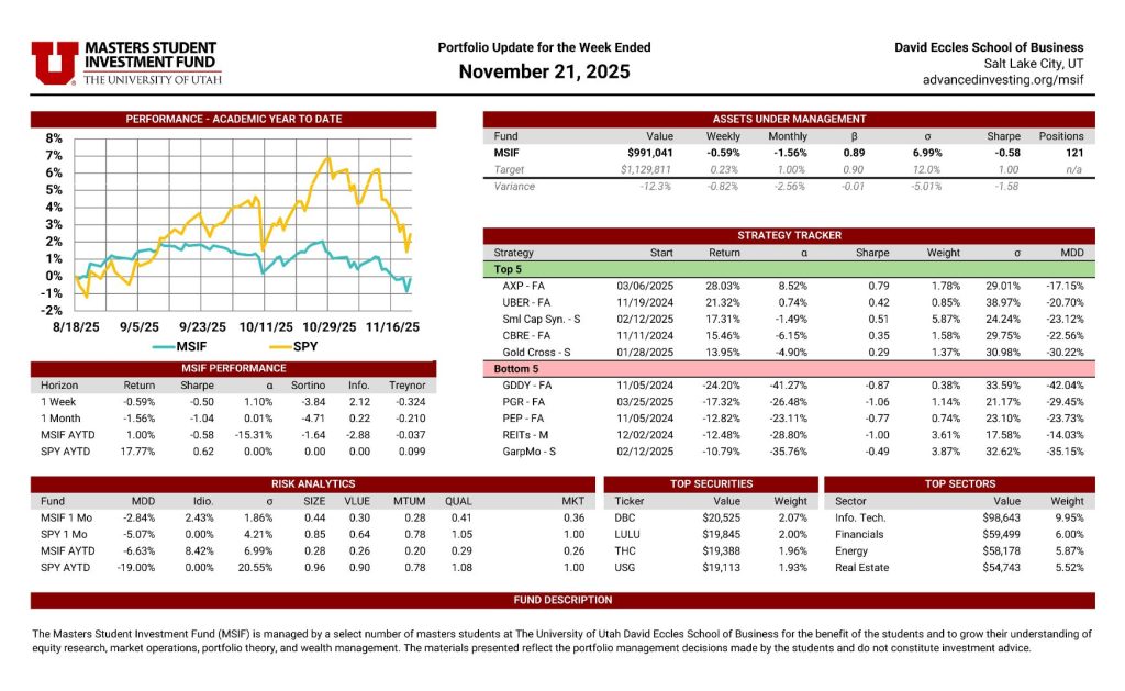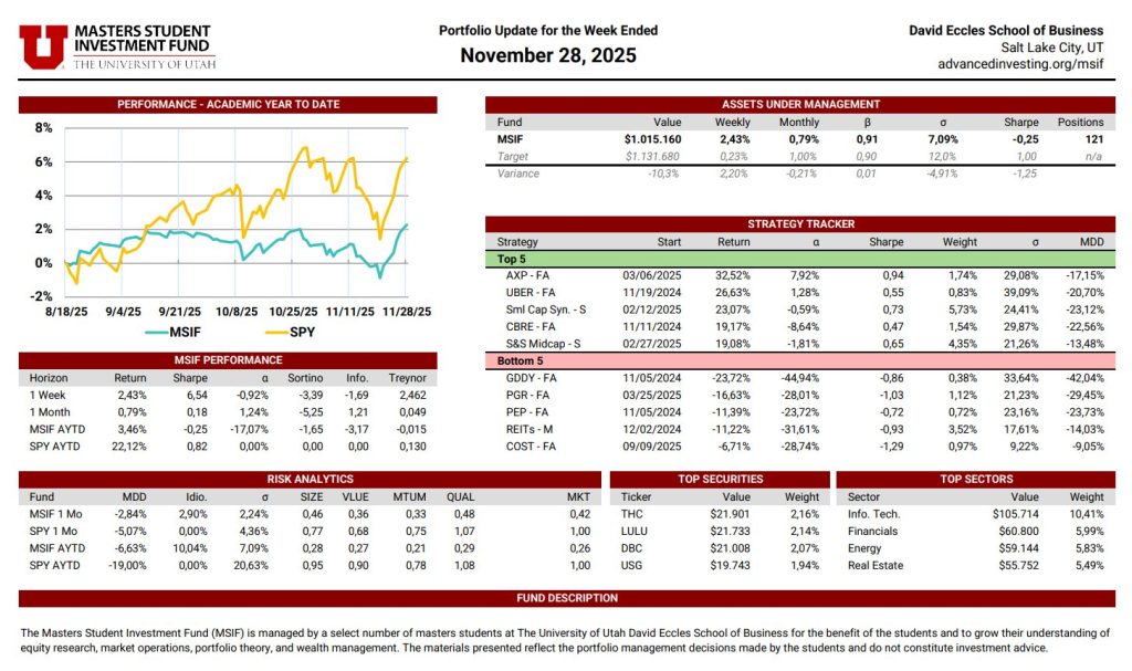 The MSIF Portfolio Update is a dynamic, continuously maintained document that provides a detailed view of the fund’s positioning and performance. Updated weekly by rotating team members, it includes performance metrics such as weekly and academic year-to-date returns, Sharpe ratio, alpha, beta, volatility, and maximum drawdown—benchmarked against our stated performance targets. The update also evaluates the contribution of each active strategy, highlights sector exposures, and presents the fund’s top holdings by dollar value. Designed to serve both as a performance dashboard and a risk management tool, this document supports informed decision-making and disciplined portfolio oversight.