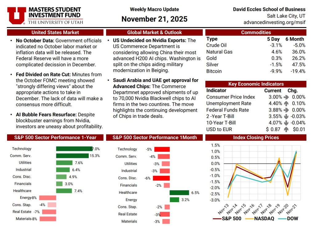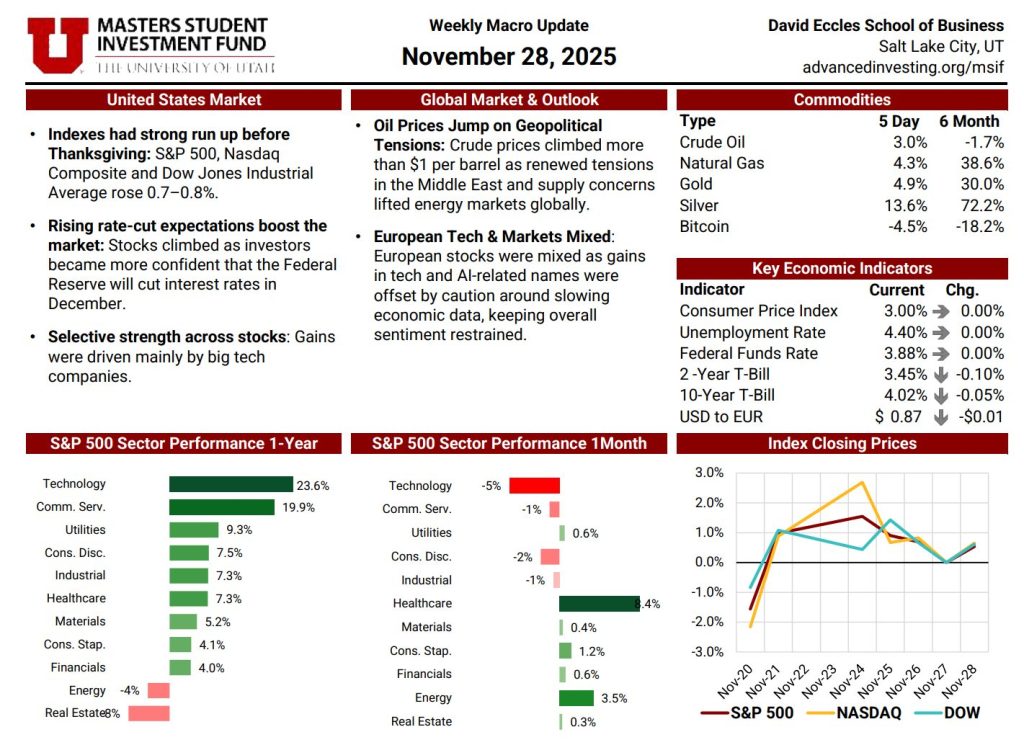 The Macro News Update is a weekly publication maintained by rotating MSIF team members to track key developments across U.S. and global markets. Each edition begins with a summary of major economic and geopolitical headlines, providing timely context around events shaping investor sentiment. The update also reviews sector performance over one-month and twelve-month periods relative to the S&P 500, followed by a weekly comparison of major indices including the S&P 500, Nasdaq, and Dow. Additional sections cover short-term commodity movements and key economic indicators—such as inflation, interest rates, unemployment, and dollar strength—offering a comprehensive snapshot of the macroeconomic landscape. This resource plays an essential role in helping the team stay informed, assess shifting market conditions, and make thoughtful, data-driven adjustments to portfolio positioning.