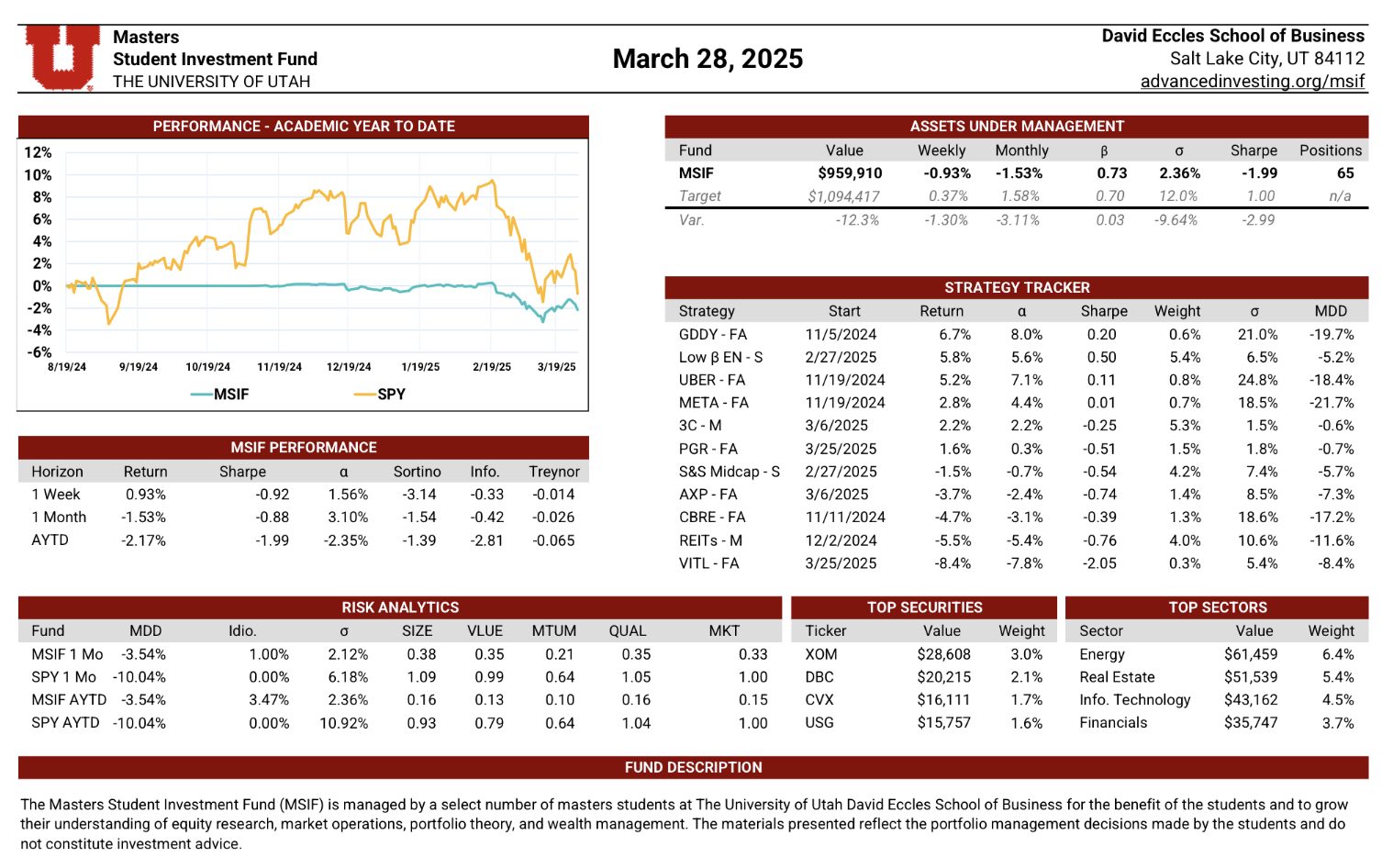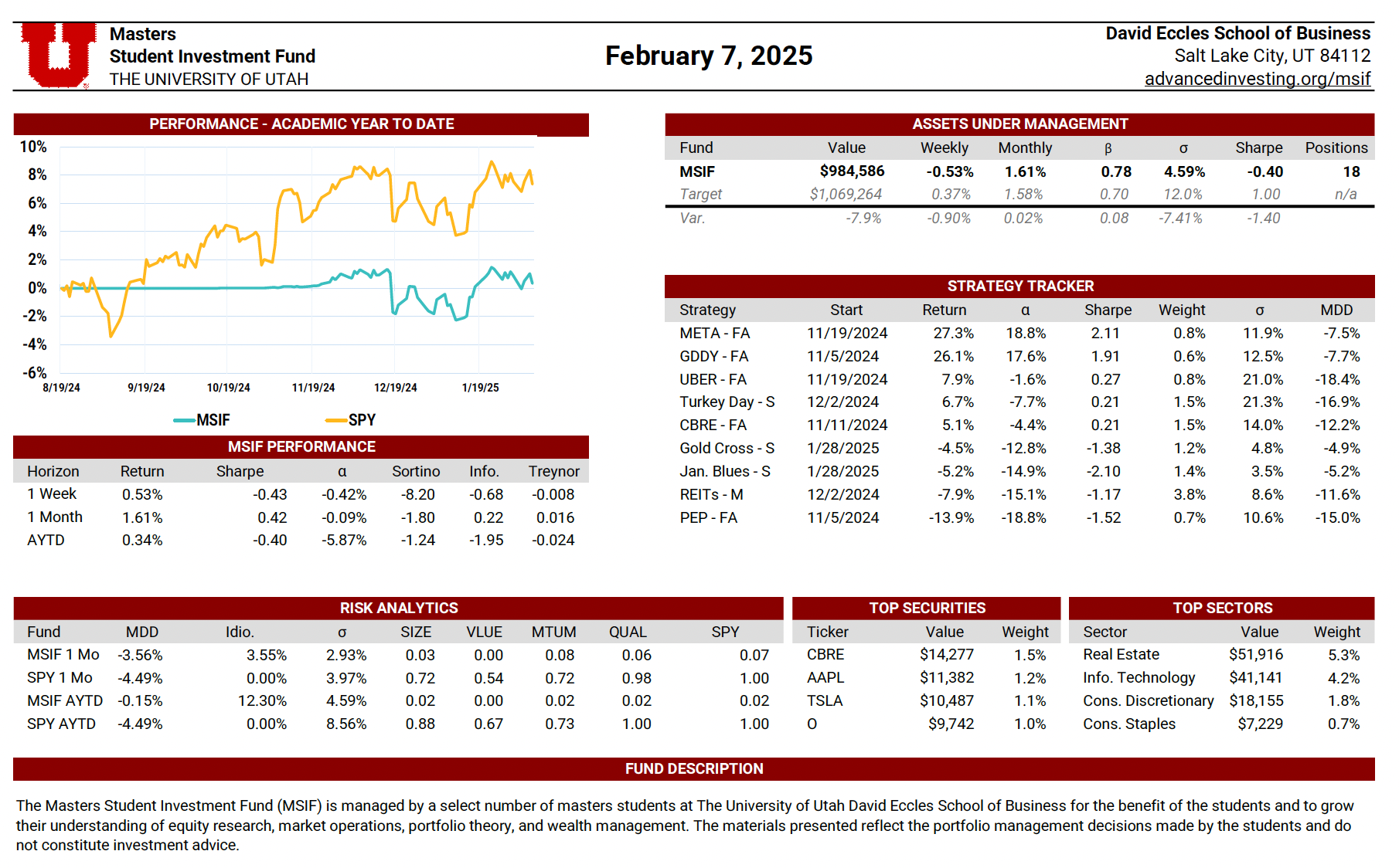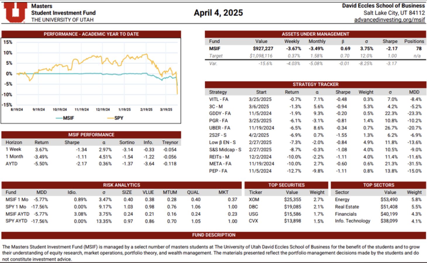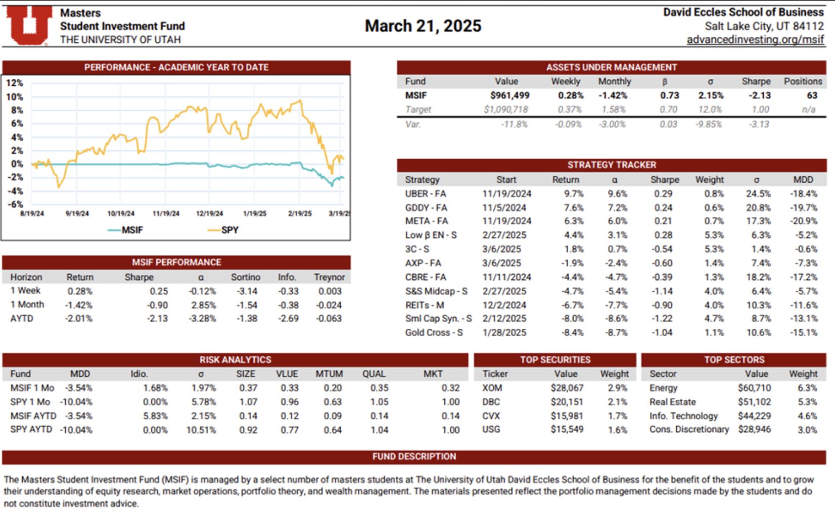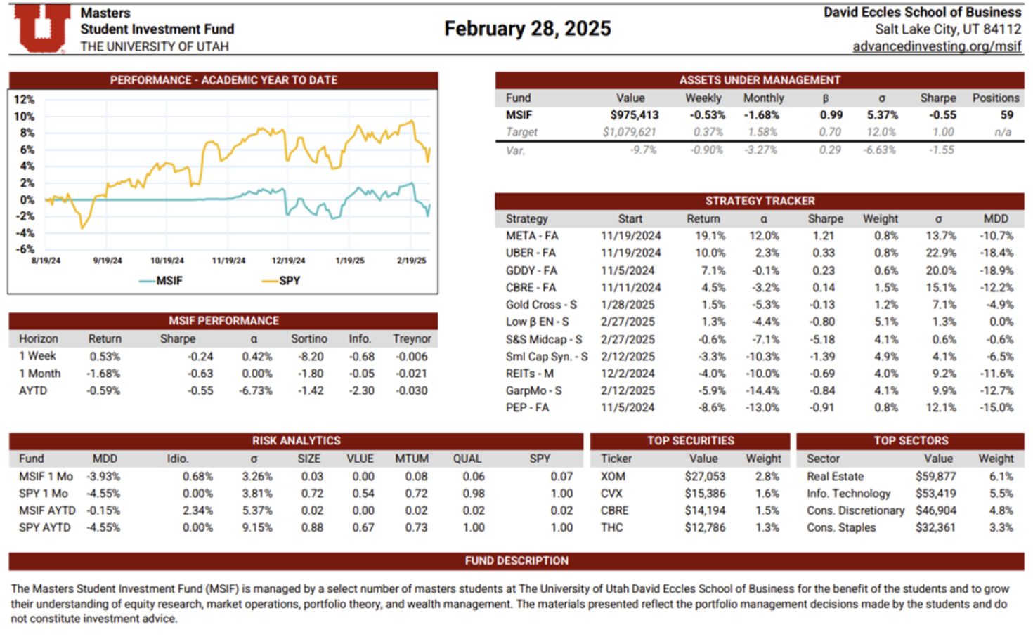 The MSIF Portfolio Update is a dynamic, continuously maintained document that provides a detailed view of the fund’s positioning and performance. Updated weekly by rotating team members, it includes performance metrics such as weekly and academic year-to-date returns, Sharpe ratio, alpha, beta, volatility, and maximum drawdown—benchmarked against our stated performance targets. The update also evaluates the contribution of each active strategy, highlights sector exposures, and presents the fund’s top holdings by dollar value. Designed to serve both as a performance dashboard and a risk management tool, this document supports informed decision-making and disciplined portfolio oversight.