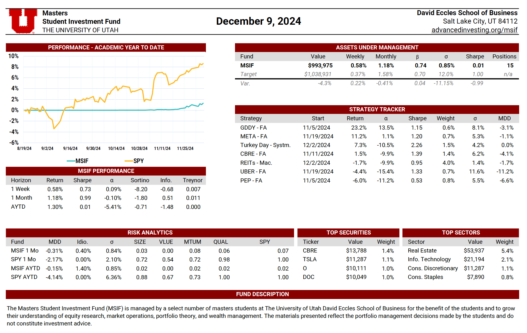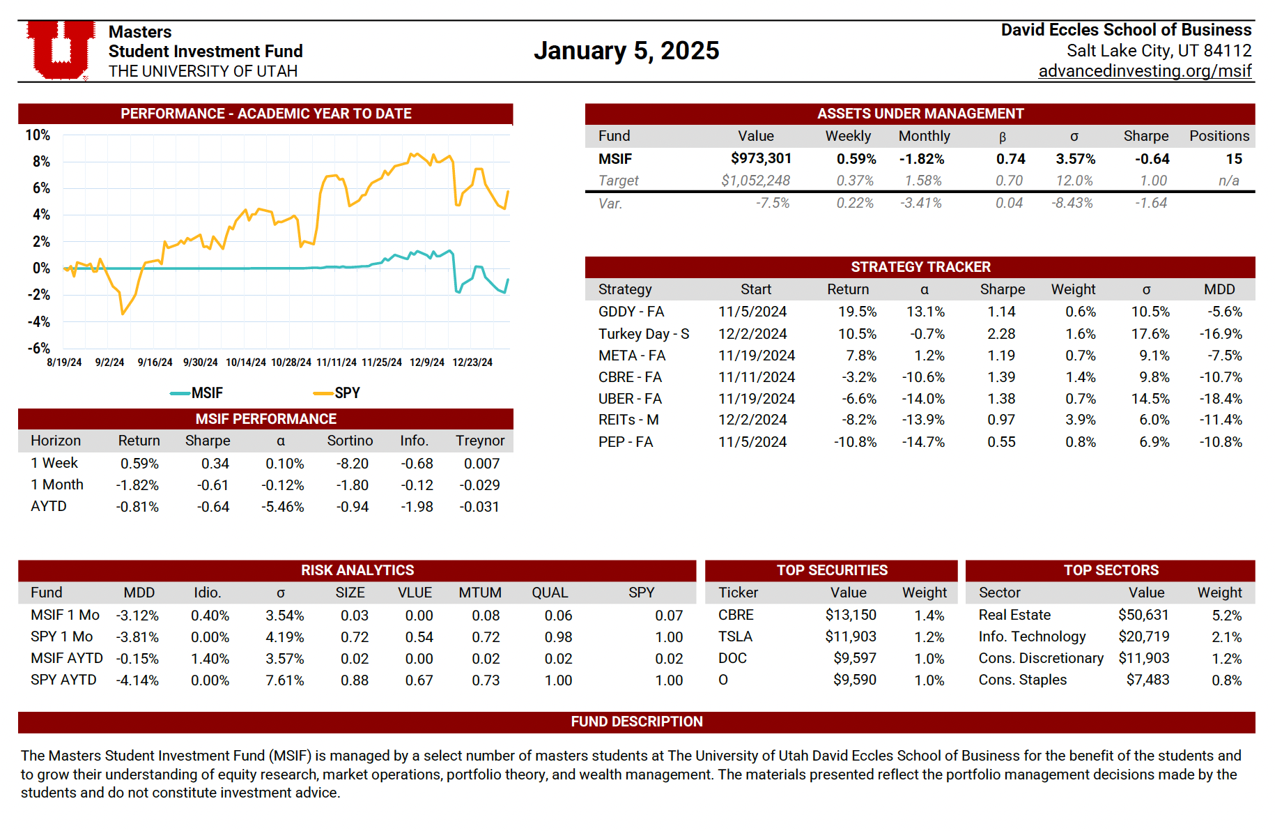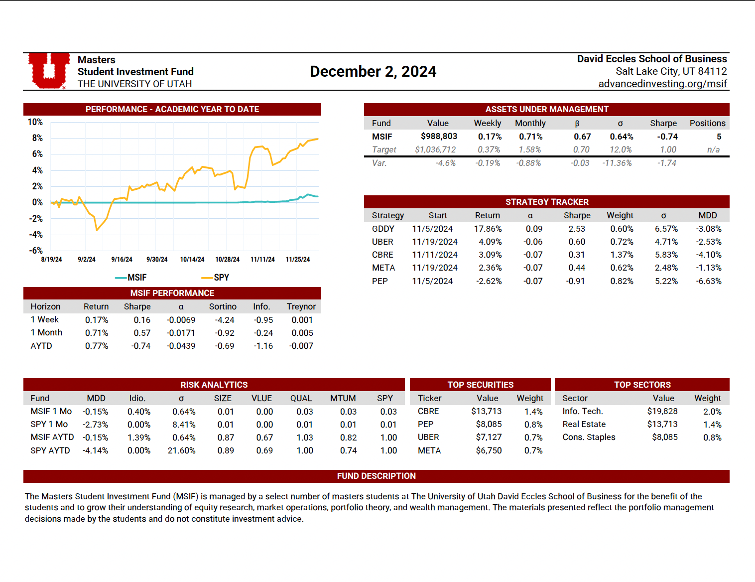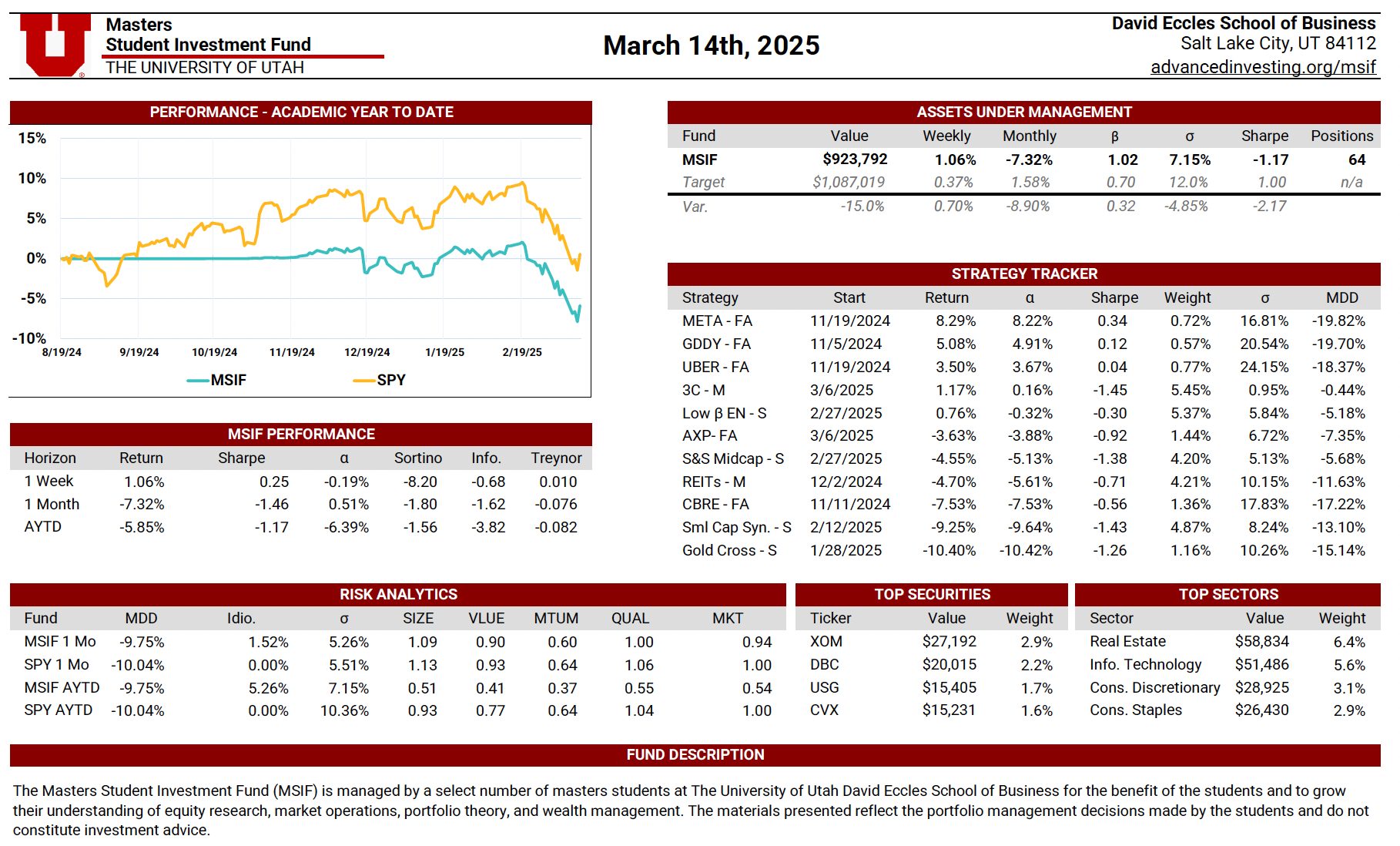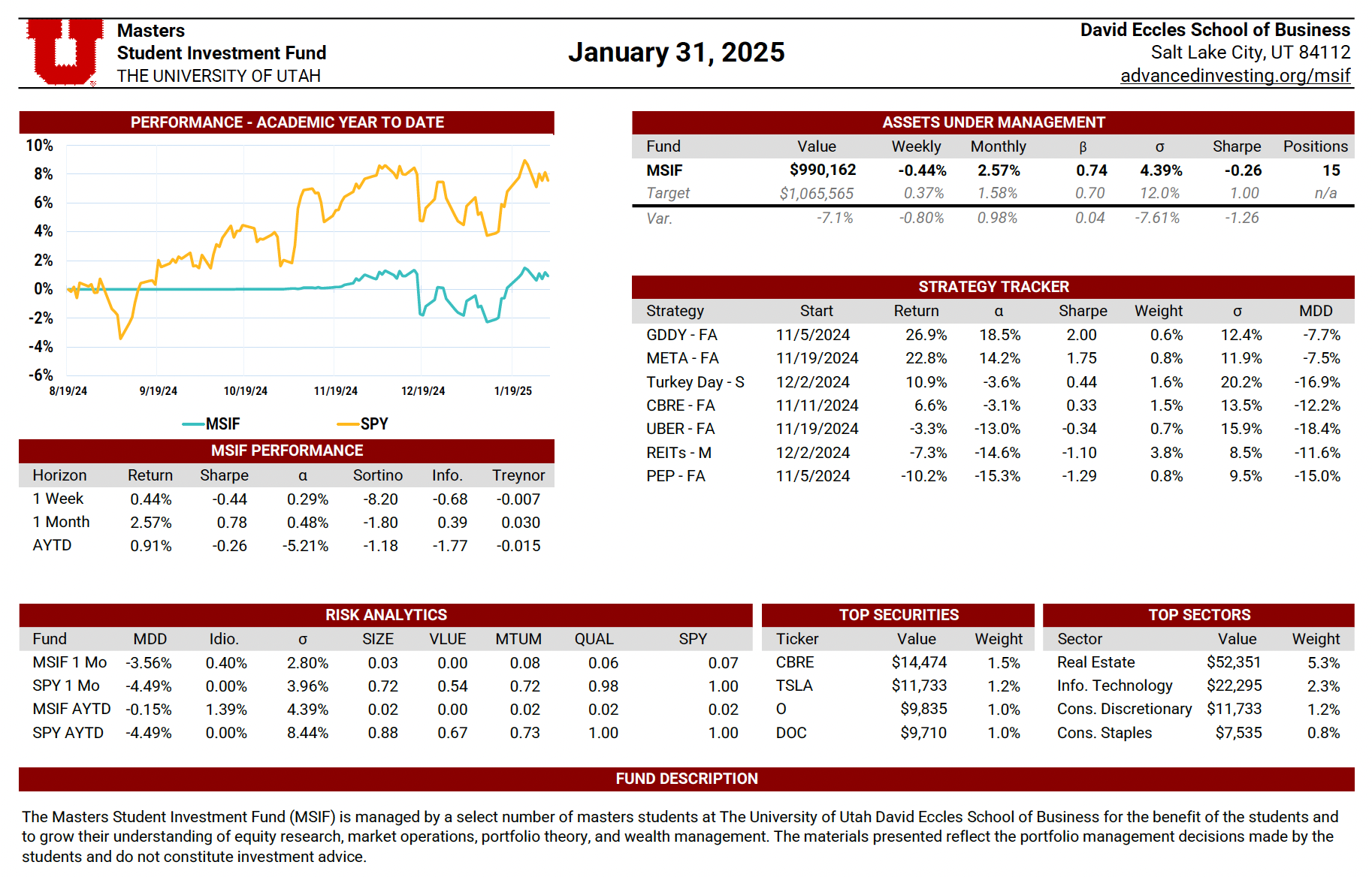 The MSIF Portfolio Update is a dynamic, continuously maintained document that provides a detailed view of the fund’s positioning and performance. Updated weekly by rotating team members, it includes performance metrics such as weekly and academic year-to-date returns, Sharpe ratio, alpha, beta, volatility, and maximum drawdown—benchmarked against our stated performance targets. The update also evaluates the contribution of each active strategy, highlights sector exposures, and presents the fund’s top holdings by dollar value. Designed to serve both as a performance dashboard and a risk management tool, this document supports informed decision-making and disciplined portfolio oversight.