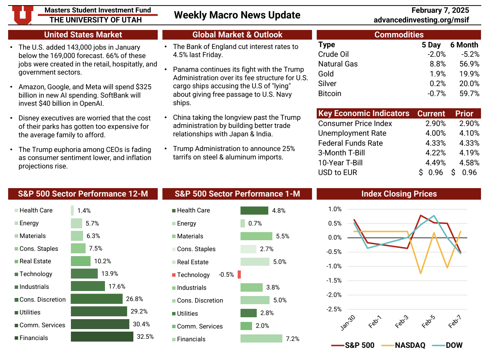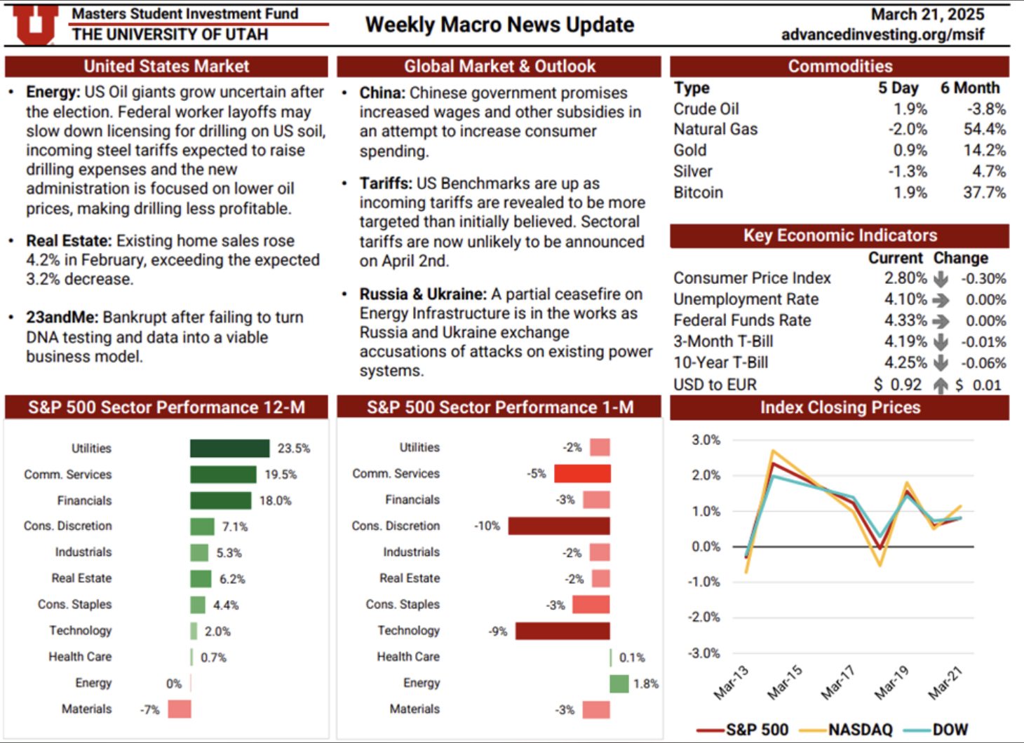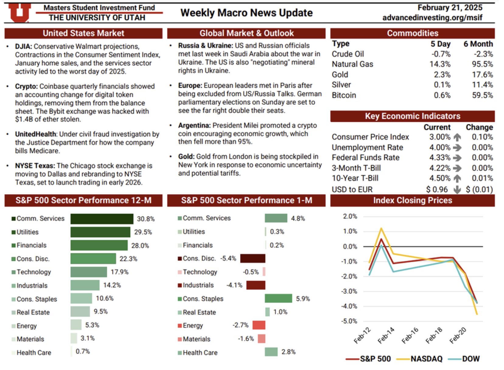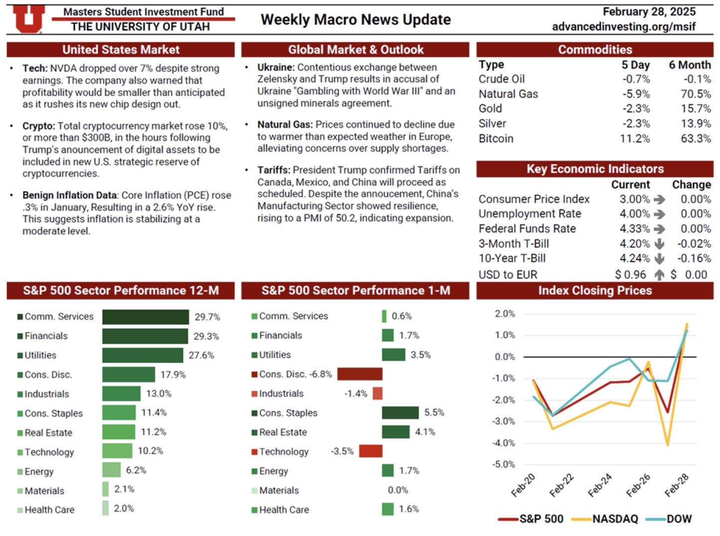 The Macro News Update is a weekly publication maintained by rotating MSIF team members to track key developments across U.S. and global markets. Each edition begins with a summary of major economic and geopolitical headlines, providing timely context around events shaping investor sentiment. The update also reviews sector performance over one-month and twelve-month periods relative to the S&P 500, followed by a weekly comparison of major indices including the S&P 500, Nasdaq, and Dow. Additional sections cover short-term commodity movements and key economic indicators—such as inflation, interest rates, unemployment, and dollar strength—offering a comprehensive snapshot of the macroeconomic landscape. This resource plays an essential role in helping the team stay informed, assess shifting market conditions, and make thoughtful, data-driven adjustments to portfolio positioning.