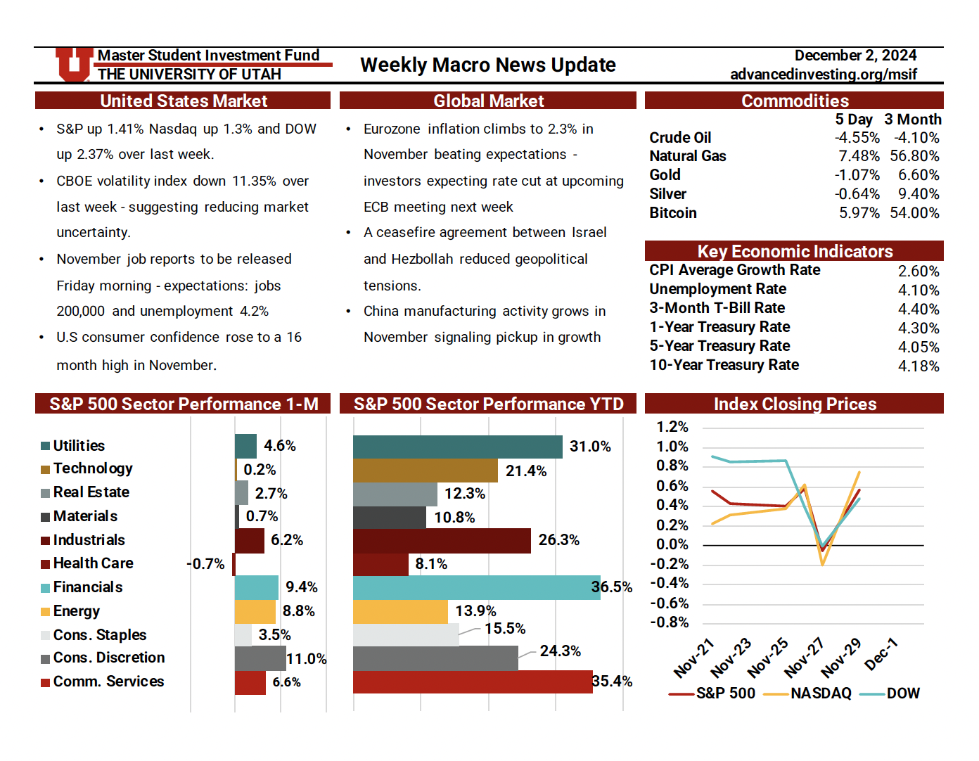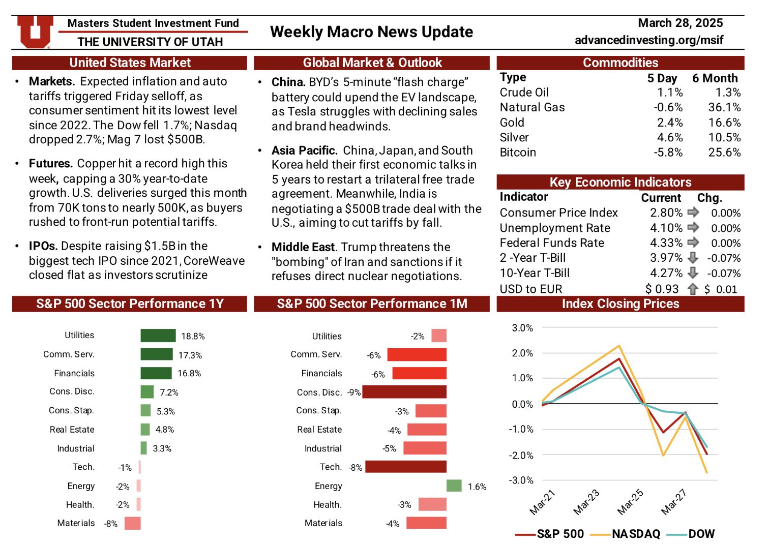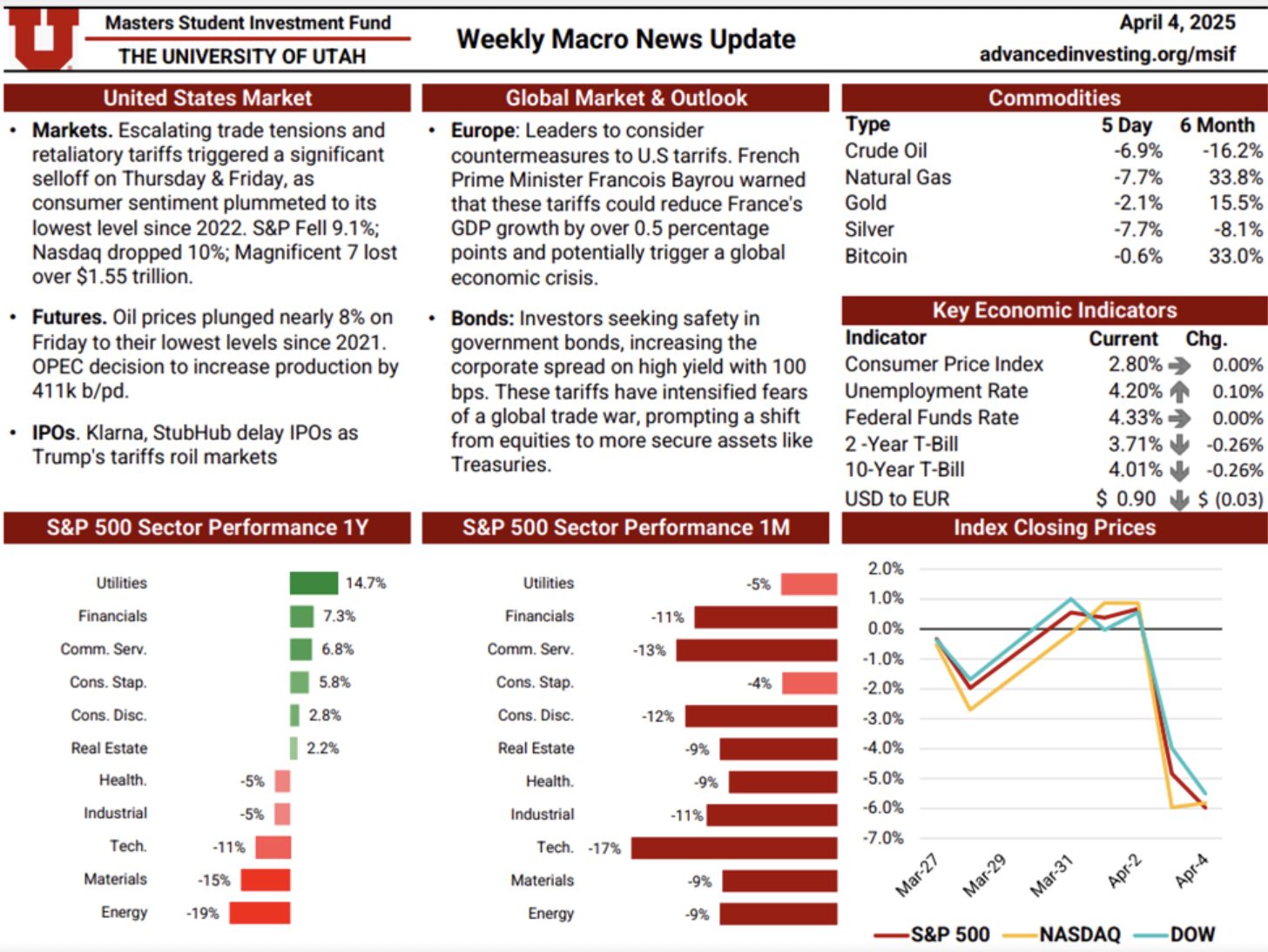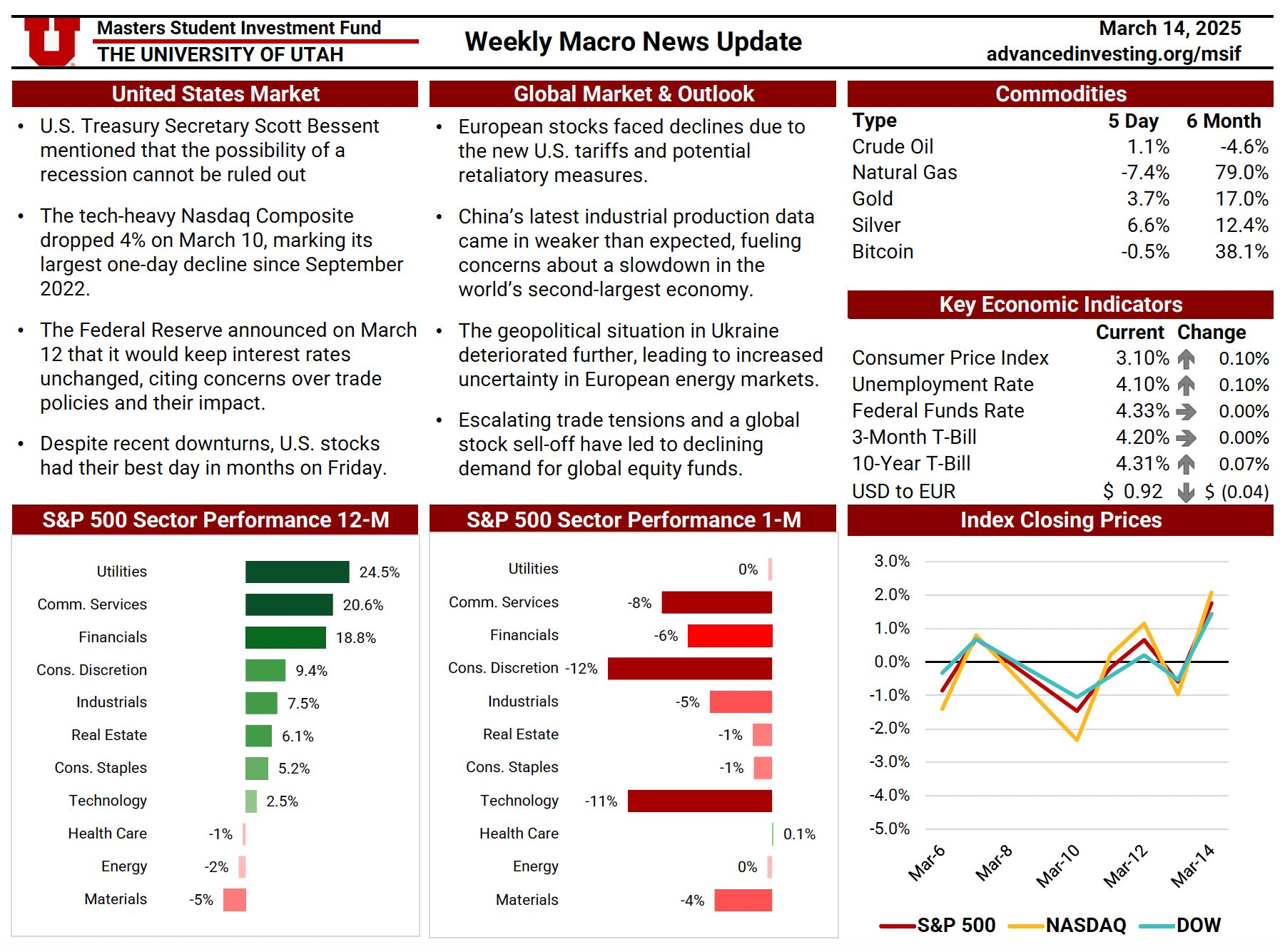 The Macro News Update is a weekly publication maintained by rotating MSIF team members to track key developments across U.S. and global markets. Each edition begins with a summary of major economic and geopolitical headlines, providing timely context around events shaping investor sentiment. The update also reviews sector performance over one-month and twelve-month periods relative to the S&P 500, followed by a weekly comparison of major indices including the S&P 500, Nasdaq, and Dow. Additional sections cover short-term commodity movements and key economic indicators—such as inflation, interest rates, unemployment, and dollar strength—offering a comprehensive snapshot of the macroeconomic landscape. This resource plays an essential role in helping the team stay informed, assess shifting market conditions, and make thoughtful, data-driven adjustments to portfolio positioning.