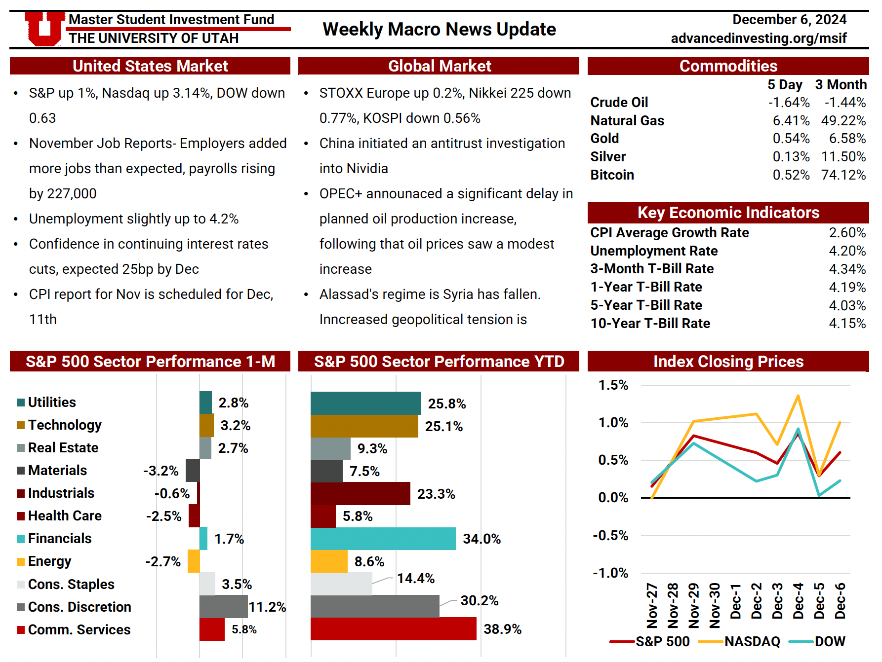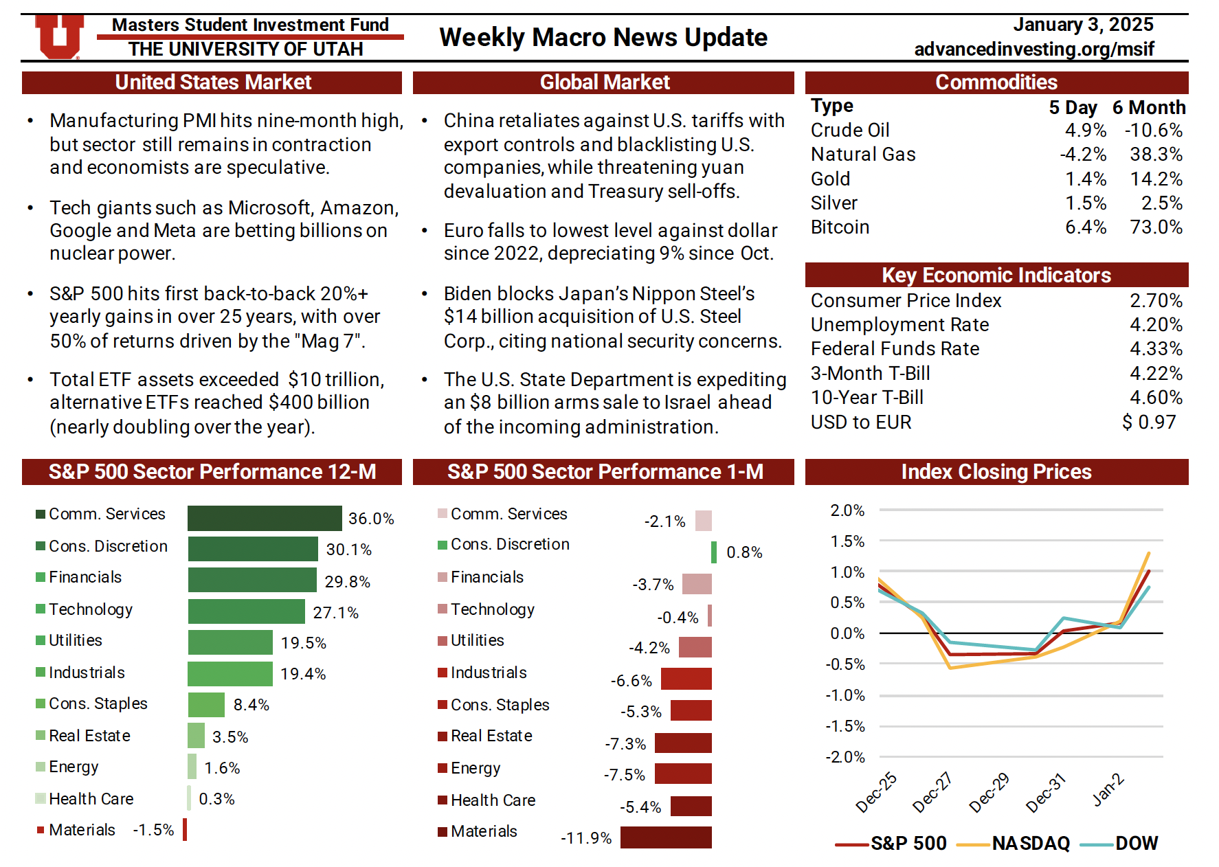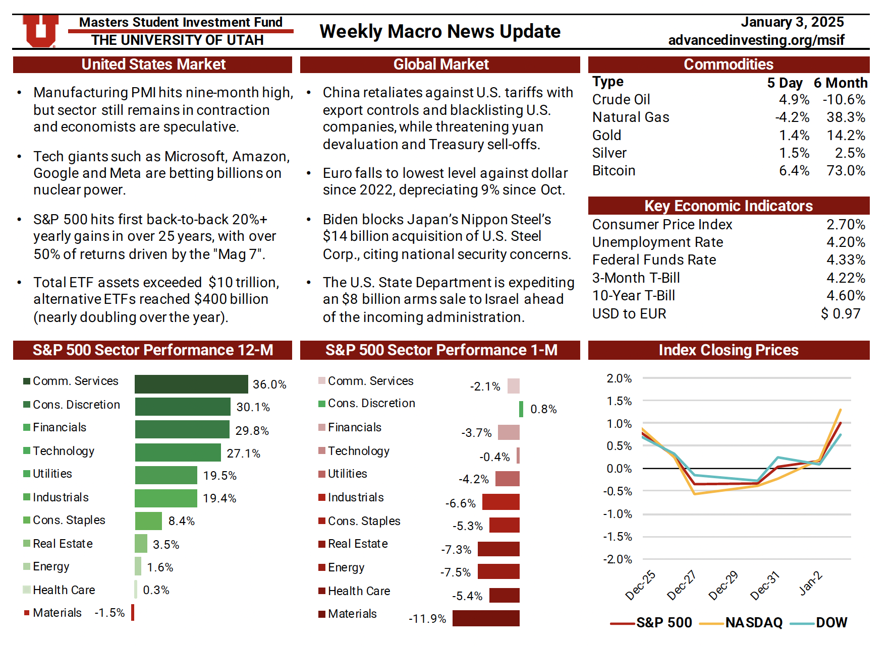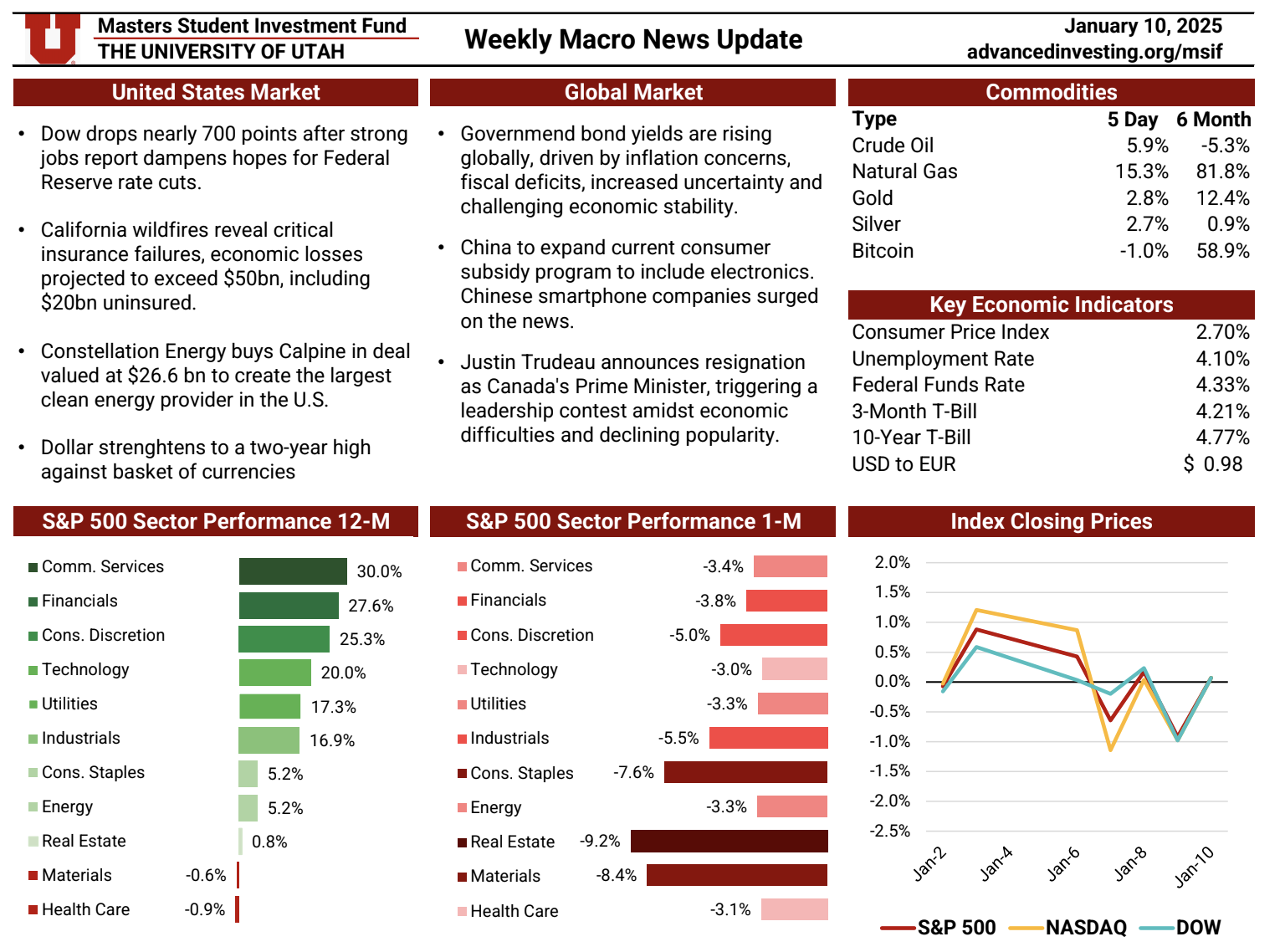 The Macro News Update is a weekly publication maintained by rotating MSIF team members to track key developments across U.S. and global markets. Each edition begins with a summary of major economic and geopolitical headlines, providing timely context around events shaping investor sentiment. The update also reviews sector performance over one-month and twelve-month periods relative to the S&P 500, followed by a weekly comparison of major indices including the S&P 500, Nasdaq, and Dow. Additional sections cover short-term commodity movements and key economic indicators—such as inflation, interest rates, unemployment, and dollar strength—offering a comprehensive snapshot of the macroeconomic landscape. This resource plays an essential role in helping the team stay informed, assess shifting market conditions, and make thoughtful, data-driven adjustments to portfolio positioning.